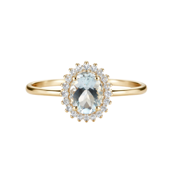 Anillo de Aquamarina 1.17 Ct con Halo de Diamantes 0.19 en Oro Amarillo 14k.