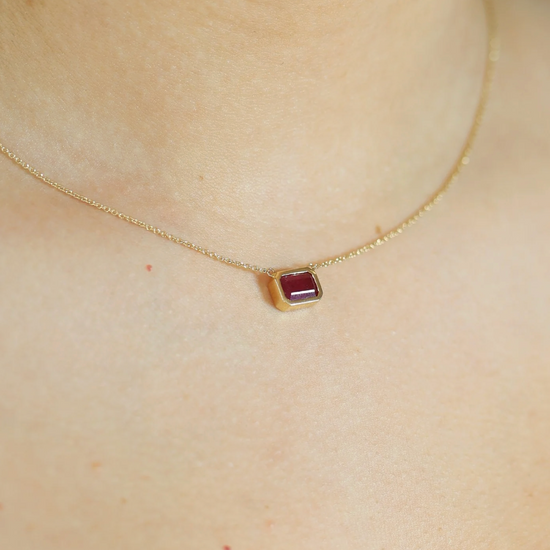 Collar de rubi corte emerald con bisel de 2.499ct en oro amarillo 18k.