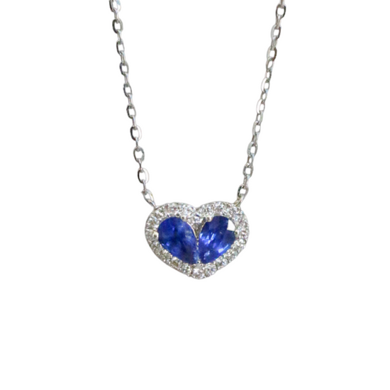 Collar de zafiros azules de corte pear en forma de corazón con halo de diamantes naturales en oro blanco 14k.