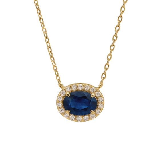 Dije de zafiro corte oval de 0.30ct y halo de diamantes de 0.03ct en oro amarillo 14k.