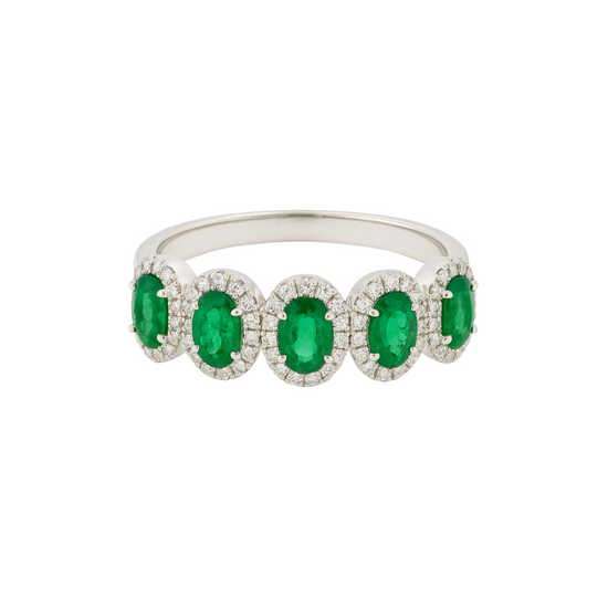 Churumbela de esmeraldas en corte oval en oro de 14k y halo de diamantes naturales.